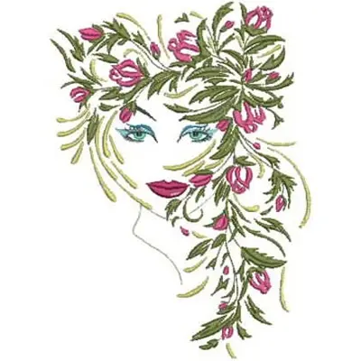 This embroidery design features a woman's face adorned with flowing greenery and blooming flowers in shades of pink. Available in all hoop sizes.