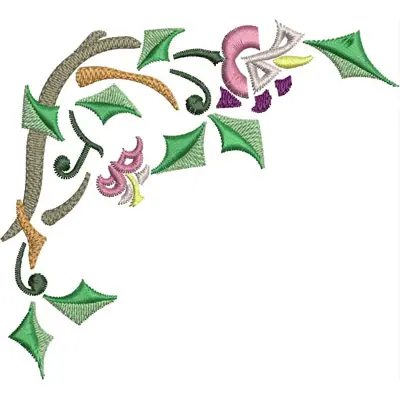 This digital machine embroidery design features a decorative floral corner featuring vibrant green leaves, delicate flowers in pink and purple, and intricate vine details. Available for 4X5 hoops.