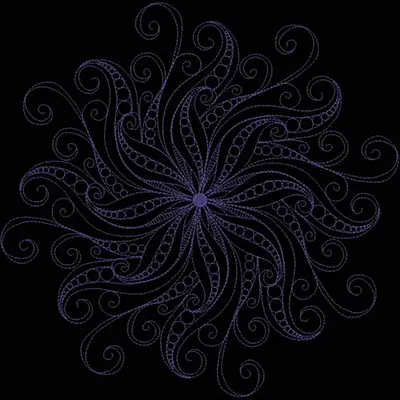This digital machine embroidery design features a swirling, floral-like pattern featuring ornate lines and circles in shades of purple. Available in all hoop sizes.
