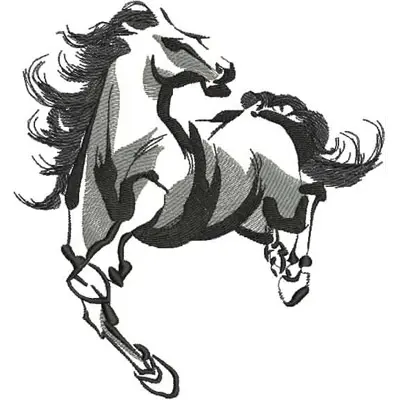This digital machine embroidery design features a galloping horse with flowing mane and detailed musculature. Available in all hoop sizes.