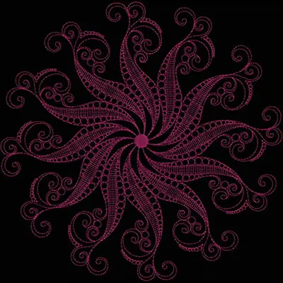 This digital machine embroidery design features a swirling floral pattern featuring intricate curves and loops in a rich pink color radiating from a central point. Available in all hoop sizes.