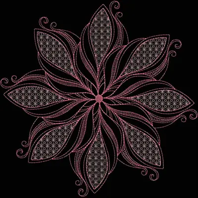 This digital machine embroidery design features an intricate floral motif featuring layered petals and delicate detailing in pink. Available in all hoop sizes.
