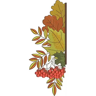 This digital machine embroidery design features colorful autumn leaves and clusters of red berries arranged in a vertical composition. Available in all hoop sizes.