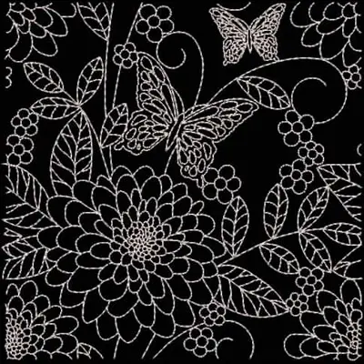 This digital machine embroidery design features intricate flowers and butterflies, featuring flowing lines and detailed floral motifs. Available in all hoop sizes.