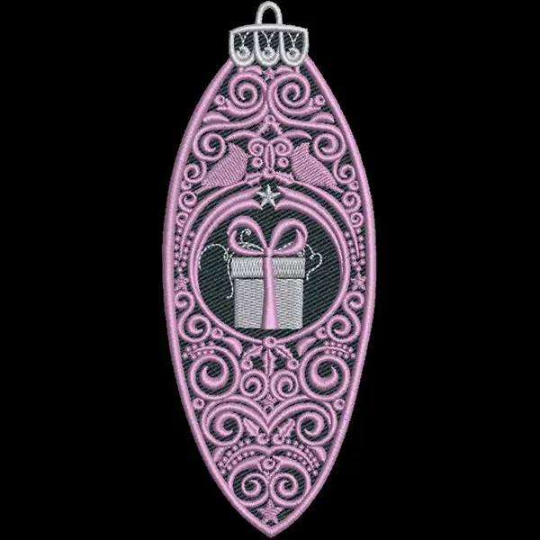 This digital machine embroidery design features a decorative ornament featuring intricate swirls and a central image of a gift wrapped with a bow. Available in all hoop sizes.