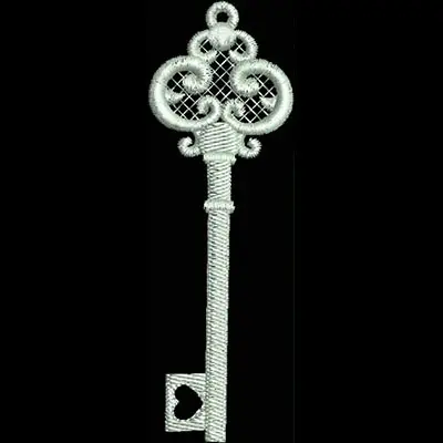 An embroidery design of an ornate key featuring a decorative bow and a heart-shaped cutout at the base.