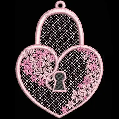 This digital machine embroidery design features a heart-shaped padlock adorned with delicate flowers and featuring a keyhole in the center. Available in all hoop sizes.