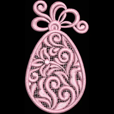 This embroidery design features a delicate pink egg-shaped ornament featuring intricate swirling patterns and a decorative bow at the top.