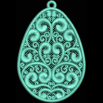 This digital machine embroidery design features an intricately detailed teardrop shape featuring swirling patterns and a lace-like texture in a mint green color. Available in all hoop sizes.