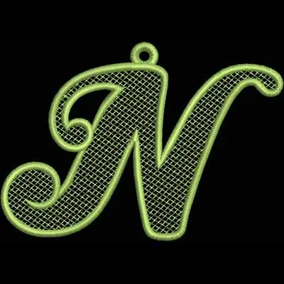 This digital machine embroidery design features a decorative letter "N" in a vibrant green color with a mesh texture. Available in all hoop sizes.