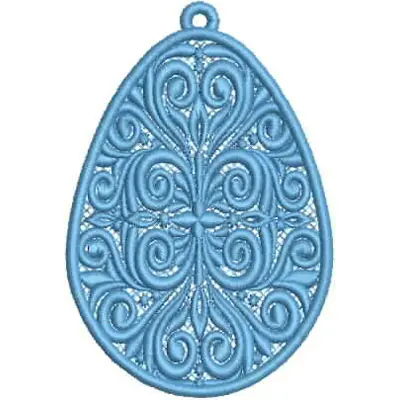 This digital machine embroidery design features an intricately detailed blue teardrop shape featuring swirling patterns and ornate flourishes. Available in all hoop sizes.