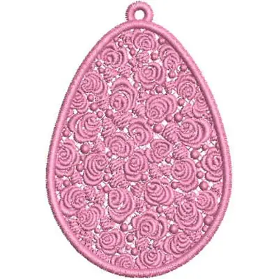 This digital machine embroidery design features an ornate pink egg shape featuring intricate rose patterns throughout. Available in all hoop sizes.