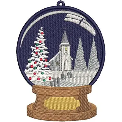 This digital machine embroidery design features a snow globe featuring a decorated Christmas tree, a quaint church, and snow-covered evergreens. Available in all hoop sizes.