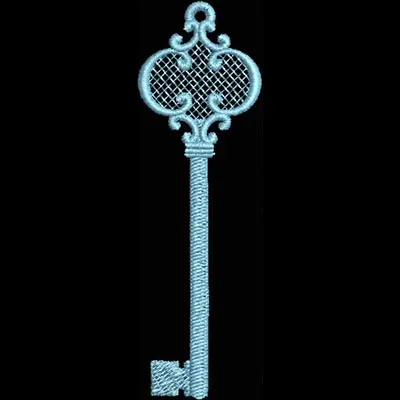 This digital machine embroidery design features an ornate key with decorative elements and a textured bow. Available in all hoop sizes.
