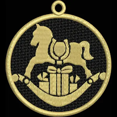 This digital machine embroidery design features a rocking horse silhouette above a wrapped gift, enclosed in a circular frame.