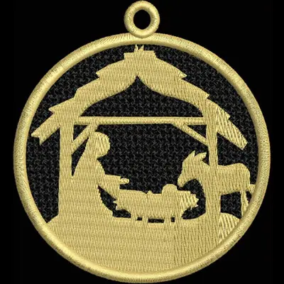 This embroidery design features a nativity scene featuring Mary, Joseph, and animals within a circular frame. Available for 4X5 hoops.