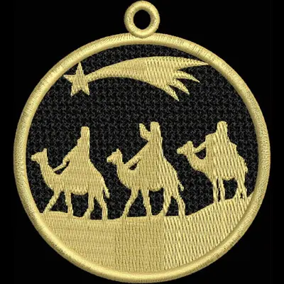 Digital machine embroidery design "FSLORNS To Bethlehem Ornament" in the christmas theme for 4x5 hoops an embroidery design of three figures riding camels under a prominent star and comet, all enclosed in a circular gold border. from Kreations by Kara.