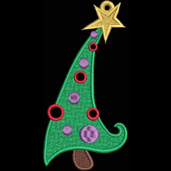 This digital machine embroidery design features a whimsical green Christmas tree adorned with colorful ornaments and topped with a golden star. Available in all hoop sizes.
