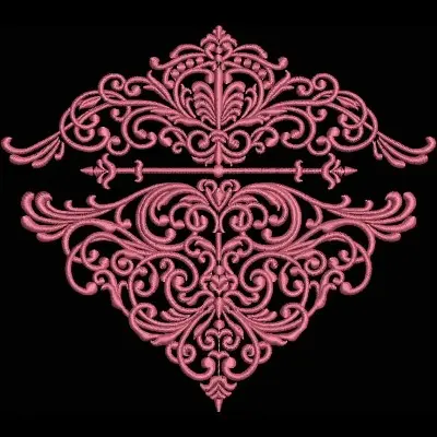 This digital machine embroidery design features intricate pink floral swirls and ornate patterns forming a symmetrical shape. Available in all hoop sizes.