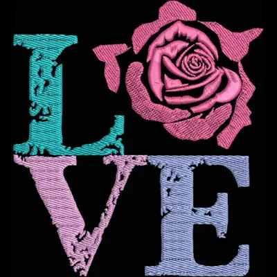 This embroidery design features the word "LOVE" in colorful letters, featuring a pink rose integrated into the letter "O". Available in all hoop sizes.