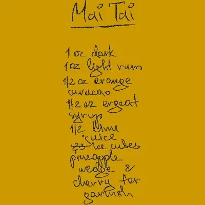 This digital machine embroidery design features a handwritten recipe for a Mai Tai cocktail, featuring ingredients and measurements listed in a casual script style. Available in all hoop sizes.
