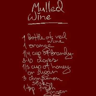 This digital machine embroidery design features a recipe for mulled wine, featuring a list of ingredients in a handwritten style. Available in all hoop sizes.