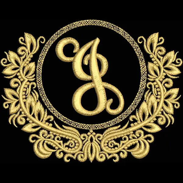 This digital machine embroidery design features an elegant, stylized letter "J" surrounded by intricate floral and scroll motifs in golden thread. Available in all hoop sizes.