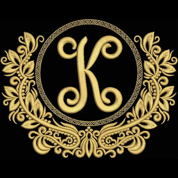 This embroidery design features an ornate circular monogram featuring the letter "K" surrounded by elegant floral motifs. Available in all hoop sizes.