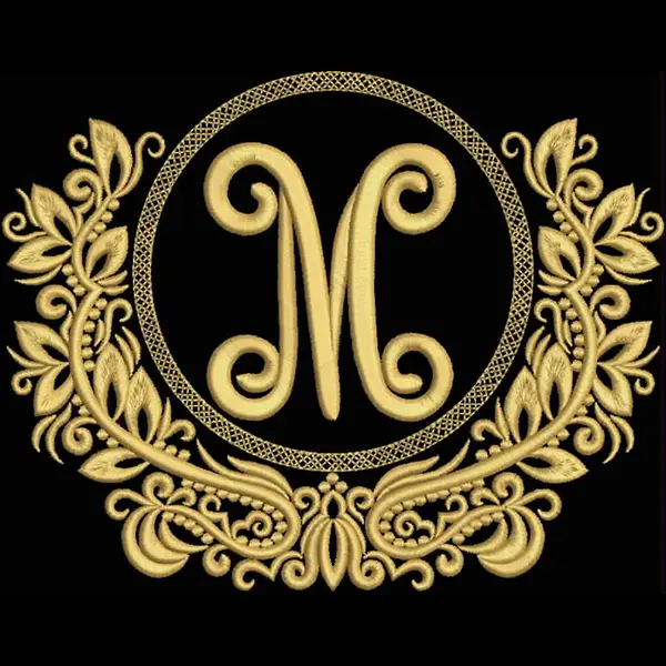 This digital machine embroidery design features a stylized letter "M" surrounded by intricate floral motifs and a circular border. Available in all hoop sizes.