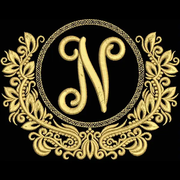 This embroidery design features an ornate circular frame featuring a stylized letter "N" at its center, embellished with delicate floral motifs.
