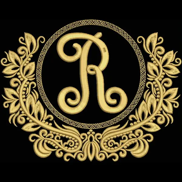 This embroidery design features an ornate letter "R" encircled by decorative floral elements in a rich gold thread. Available in all hoop sizes.