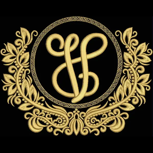 This embroidery design features an ornate monogram encircled by decorative leaves and flourishes, crafted in rich gold threads. Available in all hoop sizes.
