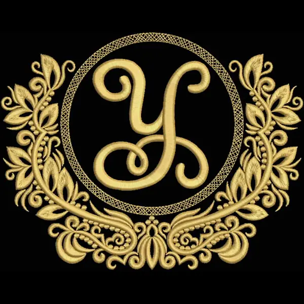 This digital machine embroidery design features an ornate monogram featuring the letter "Y" surrounded by decorative floral elements. Available in all hoop sizes.