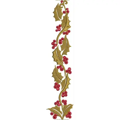 This digital machine embroidery design features a vertical vine featuring green holly leaves and red berries. Available for 5X7 hoops.