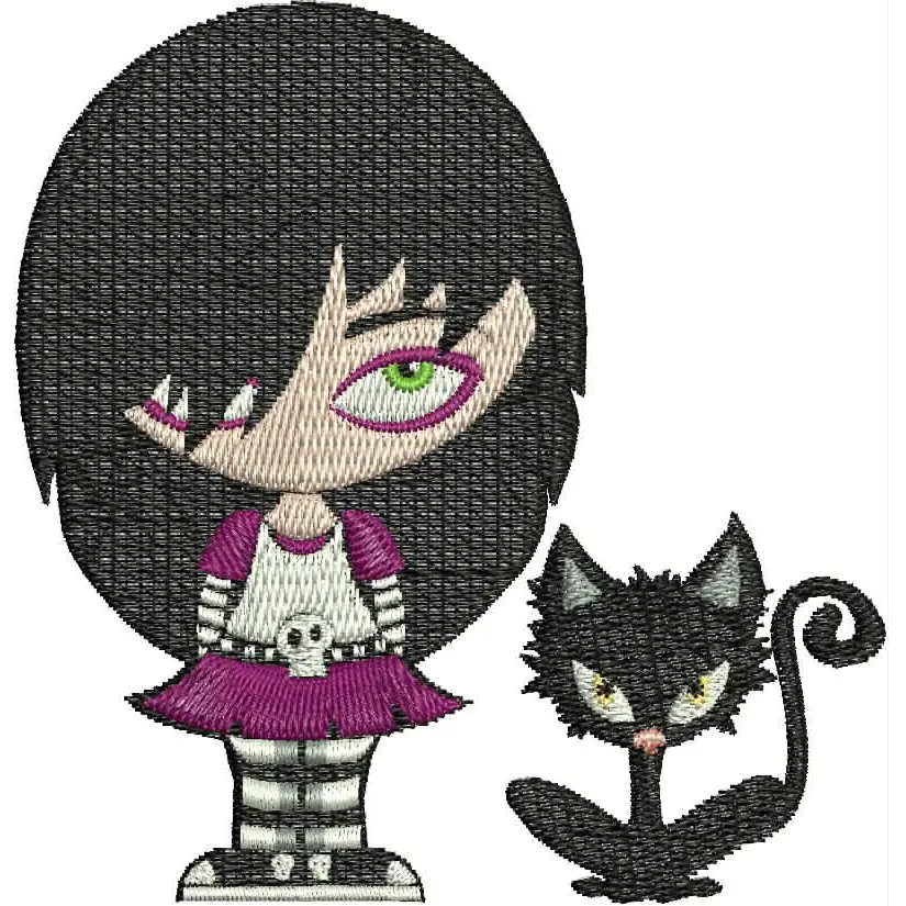 This digital machine embroidery design features a character with black hair and a pink dress standing next to a black cat with yellow eyes. Available for 4X4 hoops.