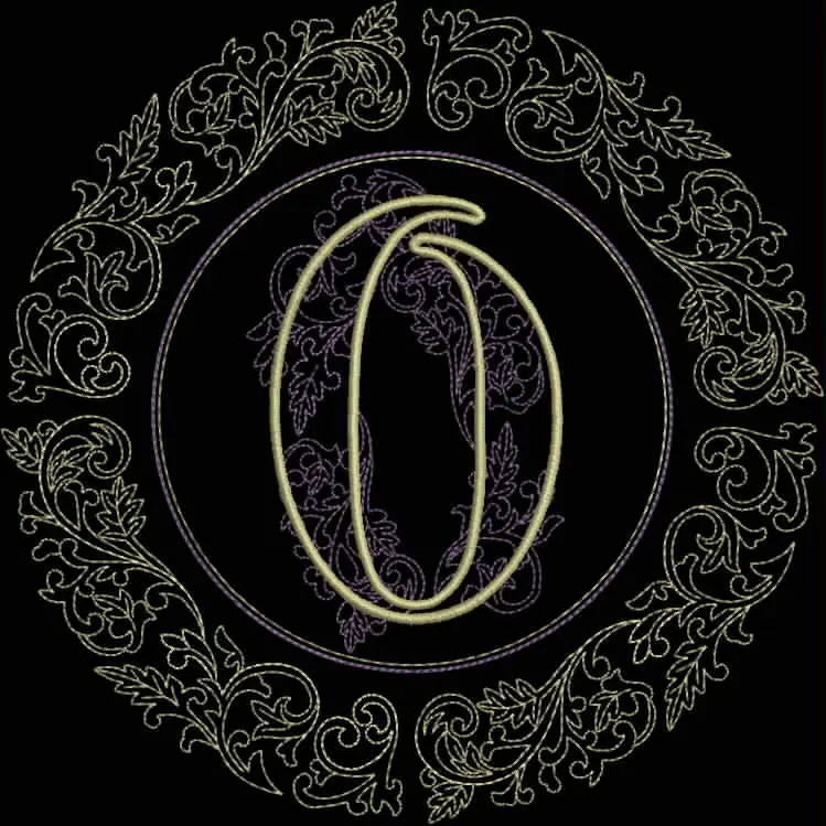 This digital machine embroidery design features a decorative letter "O" surrounded by intricate floral motifs in a circular pattern. Available in all hoop sizes.
