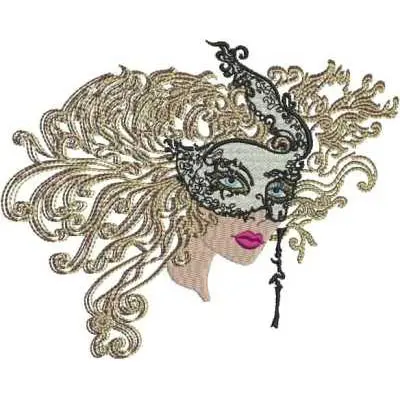 This digital machine embroidery design features a woman with elaborate hair and a decorative masquerade mask, featuring bold facial features and vibrant colors. Available in all hoop sizes.