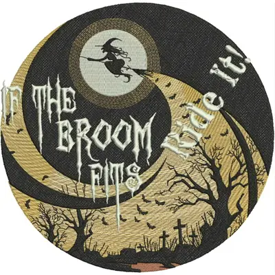 This digital machine embroidery design features a witch riding a broom across a crescent moon, accompanied by the text "If the broom fits, ride it!" in a spooky font. Available in all hoop sizes.