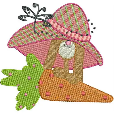 This digital machine embroidery design features a whimsical bunny wearing a stylish, oversized pink hat and holding a vibrant carrot. Available in all hoop sizes.