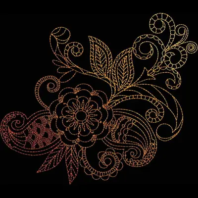 This digital machine embroidery design features intricate floral motifs featuring swirls, leaves, and a large central flower in warm colors. Available in all hoop sizes.