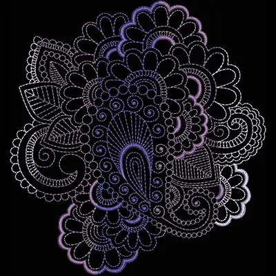 This embroidery design features intricate floral and paisley patterns, featuring swirling lines and detailed shapes in a gradient of purples and blacks.
