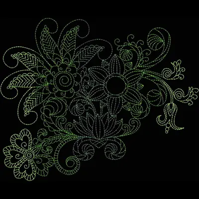 This digital machine embroidery design features intricate floral motifs featuring various leaves and blossoms in shades of green and black. Available in all hoop sizes.