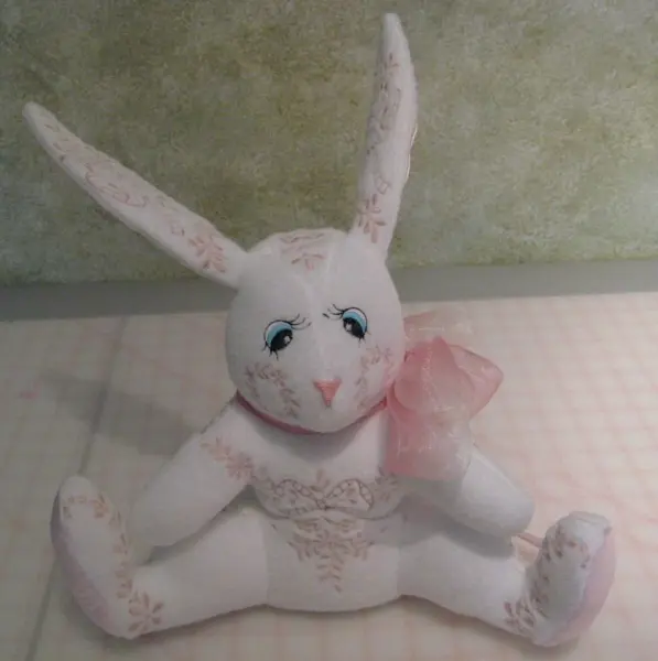 This digital machine embroidery design features a soft, white bunny with pink floral patterns and a pink ribbon tied around its neck. Available in all hoop sizes.