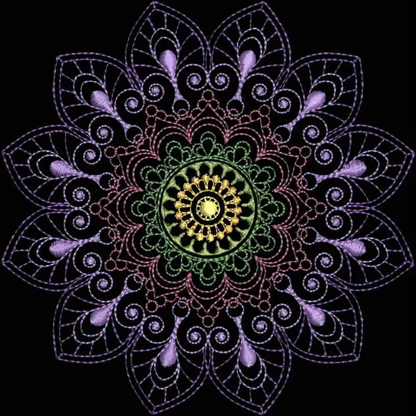 This digital machine embroidery design features a vibrant, intricate mandala featuring layers of petals in shades of purple, green, and gold, with a central circular motif. Available in all hoop sizes.