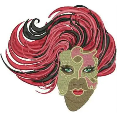 This digital machine embroidery design features a stylized woman's face with flowing red and black hair, adorned with intricate patterns and vibrant green eyes. Available in all hoop sizes.