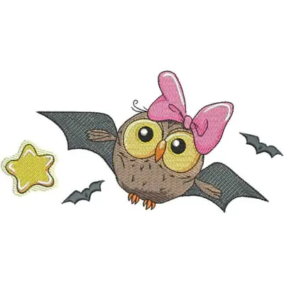 This digital machine embroidery design features a cute owl with large yellow eyes, wearing a pink bow, and flapping its wings alongside a yellow star and small bat silhouettes. Available in all hoop sizes.