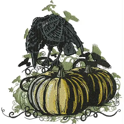 This embroidery design features a black crow perched near two pumpkins, adorned with swirling vines and leaves. Available in all hoop sizes.