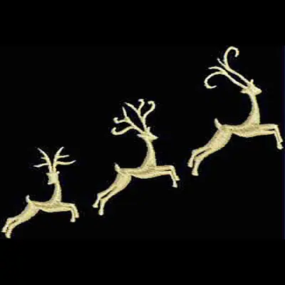 This embroidery design features three leaping reindeer, each progressively larger and adorned with intricate antlers. Available for 4X5 hoops.