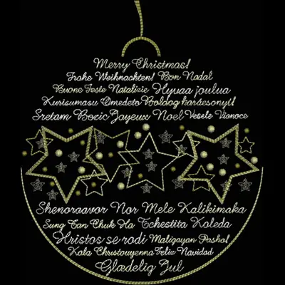 This embroidery design features a festive ornament featuring stars and various holiday greetings in multiple languages. Available in all hoop sizes.