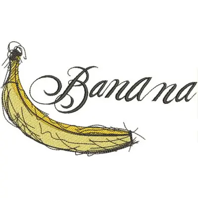 This digital machine embroidery design features a stylized banana alongside the word "Banana" in elegant script. Available in all hoop sizes.
